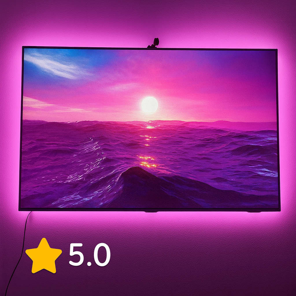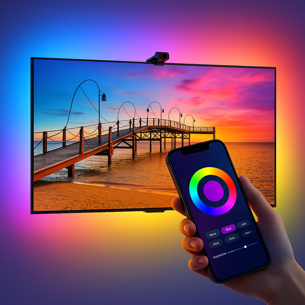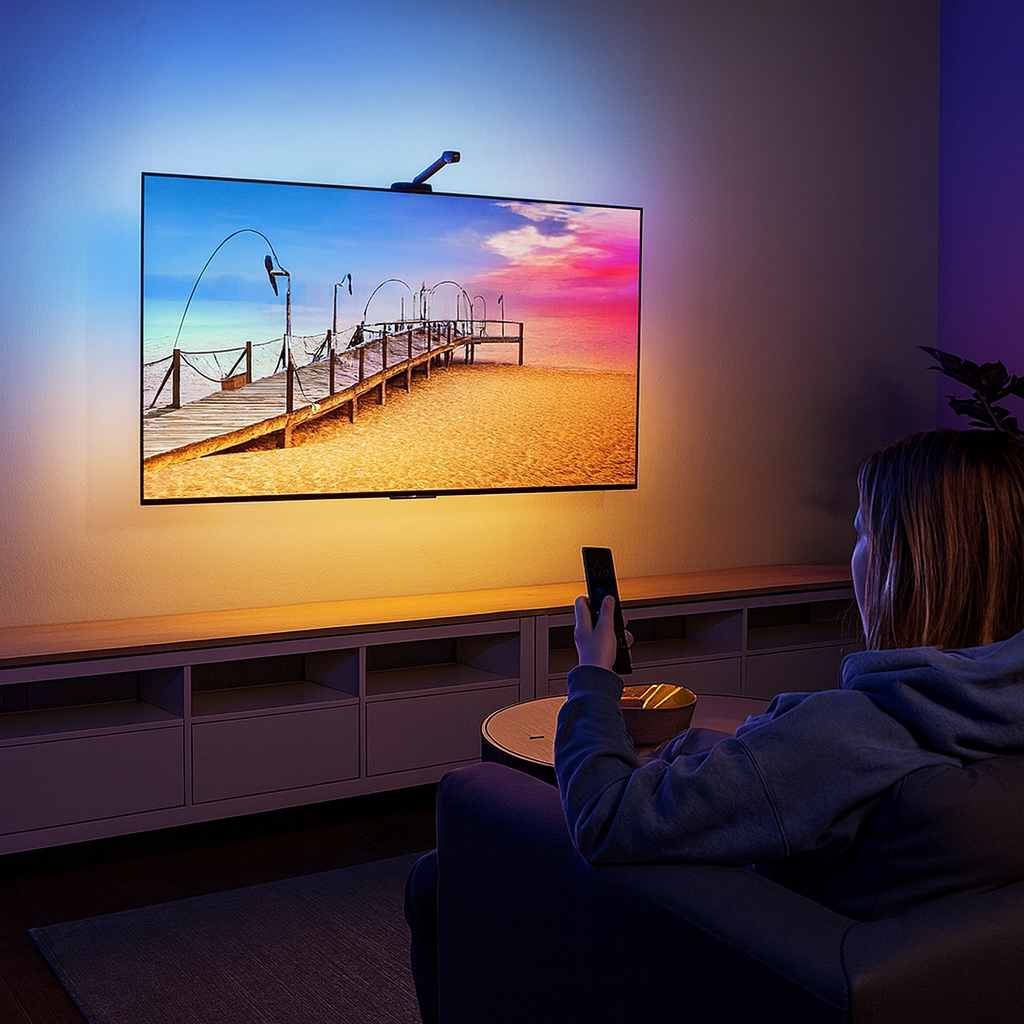 GlowifyTV™ to inteligentny system podświetlenia LED z kamerą i aplikacją, który automatycznie dopasowuje kolory światła do obrazu na ekranie telewizora, tworząc niesamowity efekt immersji.